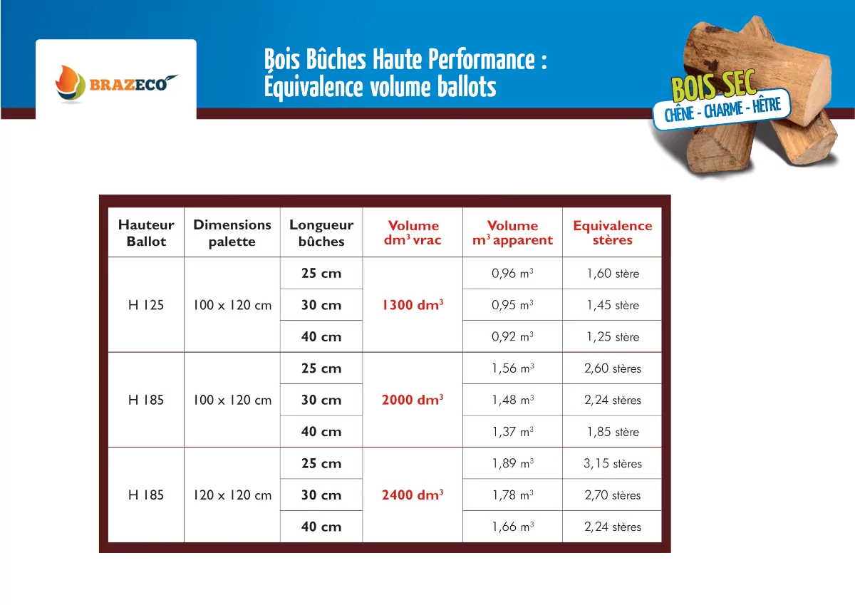 par rapport au bois traditionnel. Vous chauffez plus avec un plus petit volume de bois, le volume de la palette est de 2,6 stères mais équivaut à 3,4 stères en termes de pouvoir calorifique.